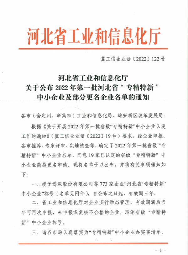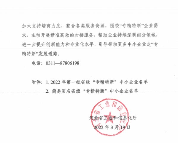 2022年3月19日,河北省工业和信息化厅公布了2022年河北省“专精特新”中小企业名单,河北古城香业集团股份有限公司被认定为“专精特新”企业。